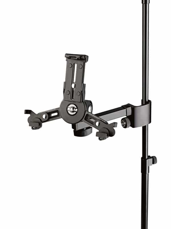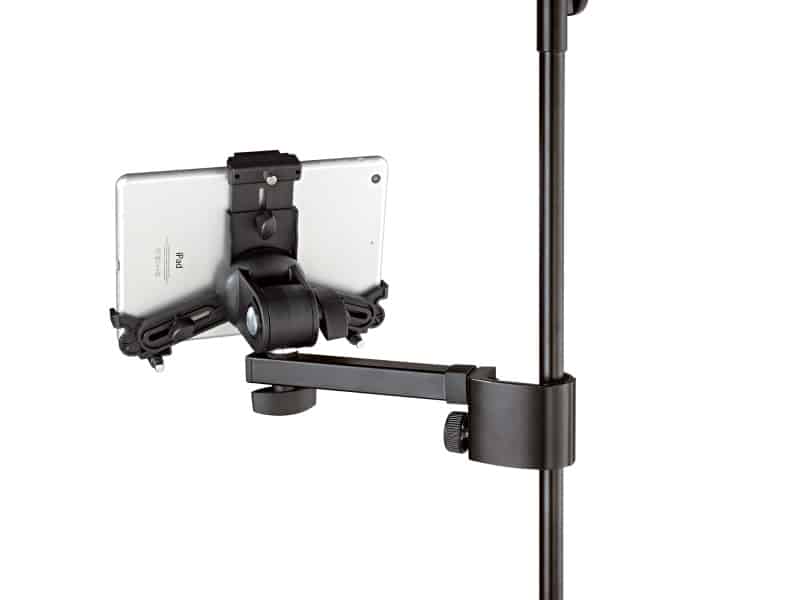 Universal Tablet Holder for different models. The Universal Tablet Holder can be adjusted variably to accommodate different tablet sizes without needing tools and holds the devices securely and effectively in many different situations. Be it on stage, in rehearsal rooms or at home – thanks to the strong clamp element with the ergonomic clamp screw the holder can be attached to any tube up to 30 mm quickly and easily. The individually adjustable support arms can accommodate the use of tablets ranging in height from 102 to 189 mm and a width from 163 to 242 mm (such as e.g. iPad mini, iPad Pro 9.7, Amazon Fire HDX 8.9, Google Nexus 9). The depth of the tablets can vary between 6 and 11 mm. For the first use of the tablet holder the support arm settings are made by adjusting the clamp screws to the size and depth of the tablet. For other uses the tablet can be attached and detached quickly and simply through a snap lock. A handy wing nut allows one to adjust the angle, so that each user will easily be able to find their ideal individual position. The tablet can switch between portrait and landscape positions. The tablet is kept in place, there is no danger of the tablet switching position by itself.