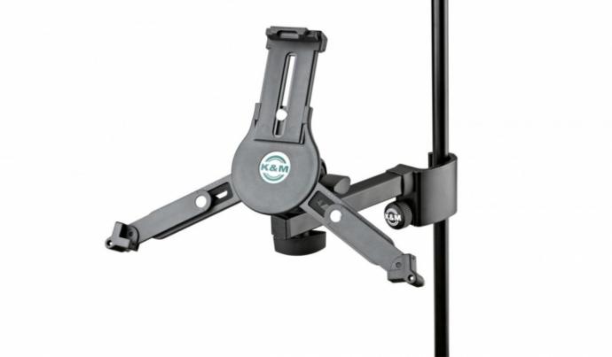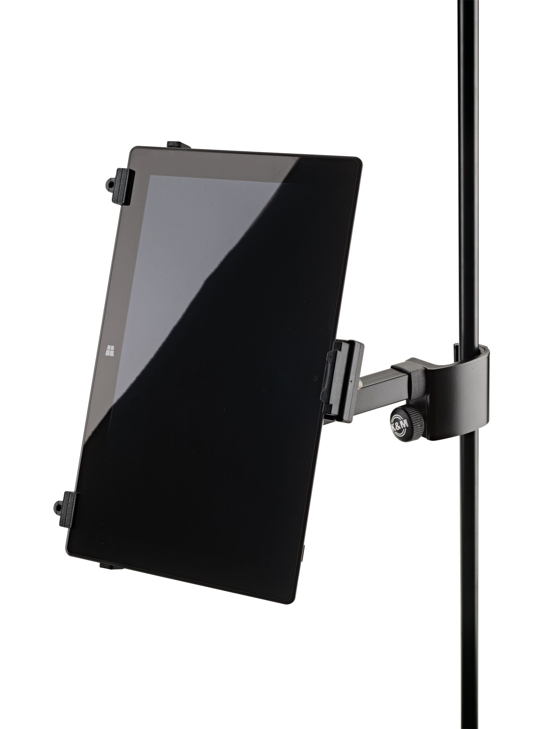 Universal Tablet Holder for different models. The Universal Tablet Holder can be adjusted variably to accommodate different tablet sizes without needing tools and holds the devices securely and effectively for many different situations. Be it on stage, in rehearsal rooms or at home – thanks to the strong clamp element with the ergonomic clamp screw the holder can be attached to any tube up to 30 mm quickly and easily. The individually adjustable support arms can accommodate the use of tablets ranging in height from 128 to 232 mm and width from 222 to 334 mm (for example iPad, iPad Air, iPad Pro, Amazon Fire HDX 8.9, Samsung Galaxy Tab from 9.7, Google Nexus 9, Asus Transformer or Microsoft Surface as well as Surface Pro). The depth of the tablets can vary between 6 and 11 mm. For the first use of the tablet holder the support arms settings are made by adjusting the clamp screws to the size and depth of the tablet. For other uses the tablet can be attached and detached quickly and simply through a snap lock. A handy wing nut allows one to adjust the angle, so that each user will easily be able to find their ideal individual position. The tablet can switch between portrait and landscape positions. The tablet is kept in place, there is no danger of the tablet switching position by itself.