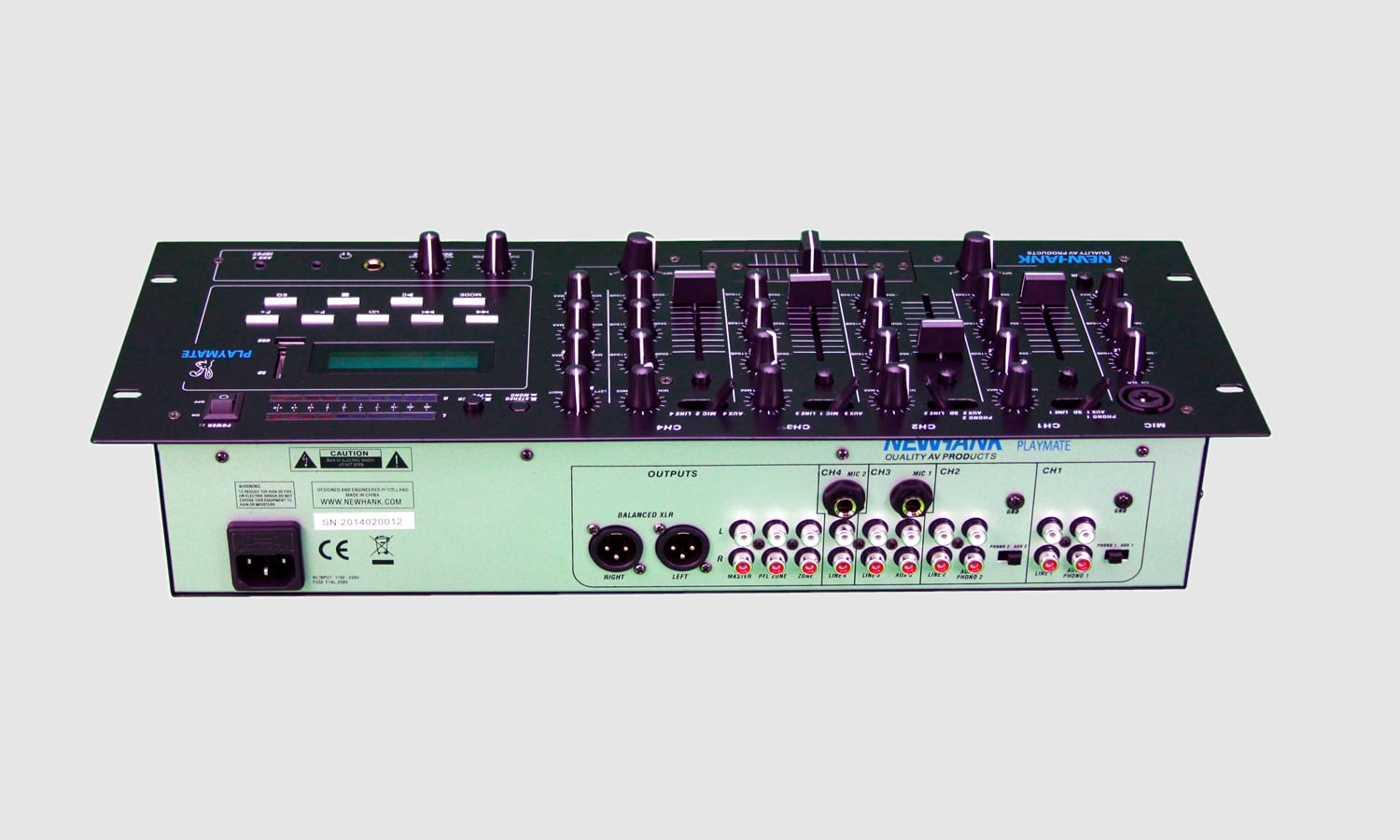 Looking for a very versatile media player and mixer? Meet the NEW NewHanK PLAYMATE professional 4HE 19? stereo rack mixer and media player. The PLAYMATE offers you plenty of control over your input channels and let’s you connect music sources like Satellite & Cable tuners, CD-players, other type of players or mixers, turntables, microphones, and so on. Connections are on the top – so please remember this while planning your rack. If you need connections on the rear – please check out the the NEW WORKMATE.