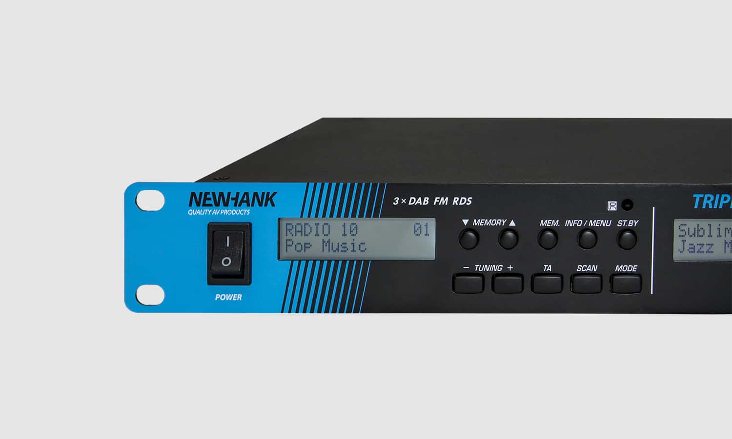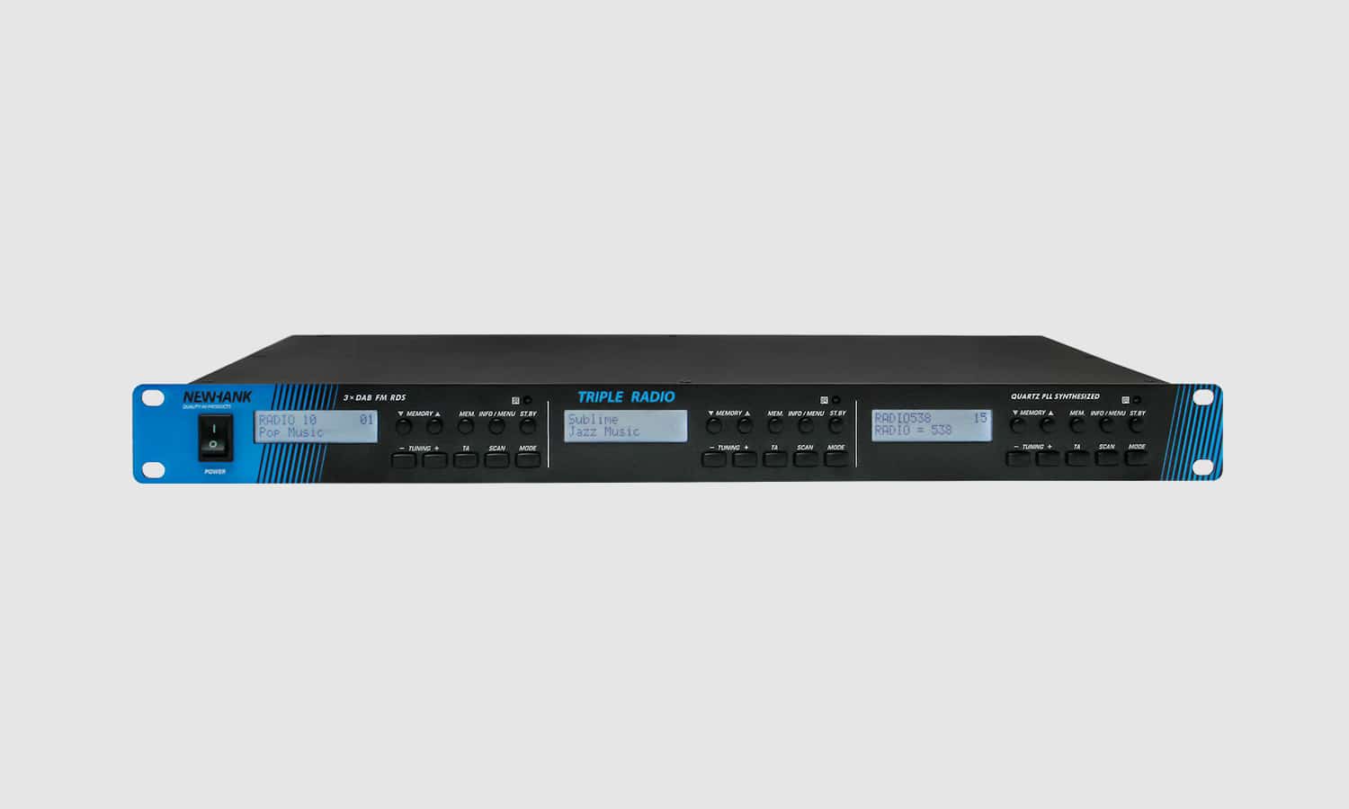 Newhank Triple Radio is a 3 independent DAB / FM RDS Stereo Tuners in 1 unit 19 inch housing and a reliable Free to Air Multi-Source solution.Enabling you to output 3 of your preferred Digital or Analog Radio stations at the same time, not compromising on the audio quality, make the Newhank Triple Radio a Perfect fit inside any redundant professional distributed audio system.